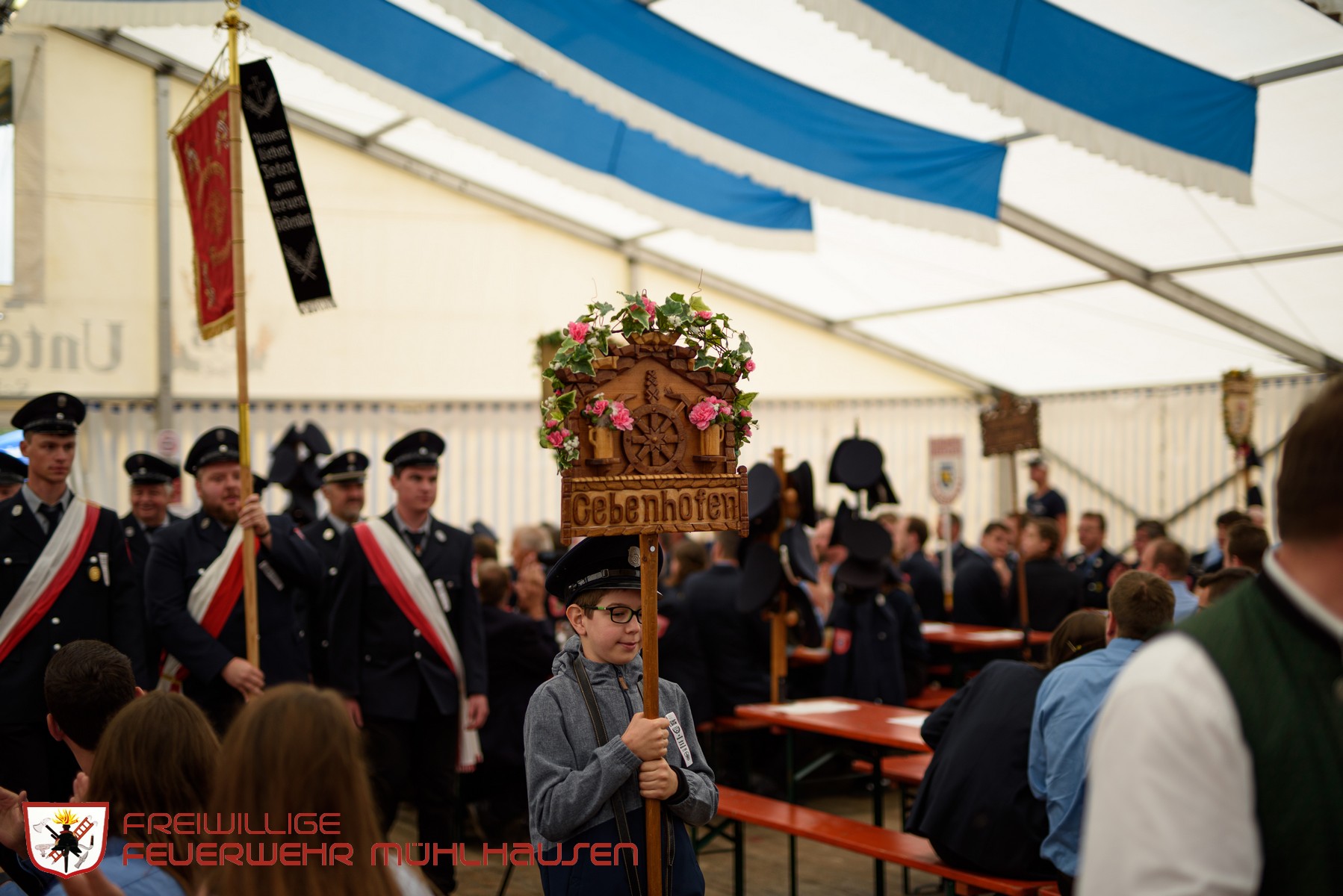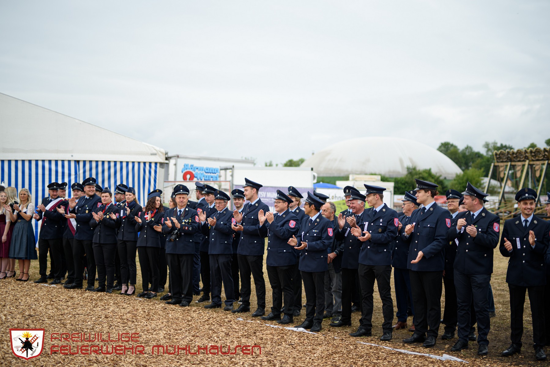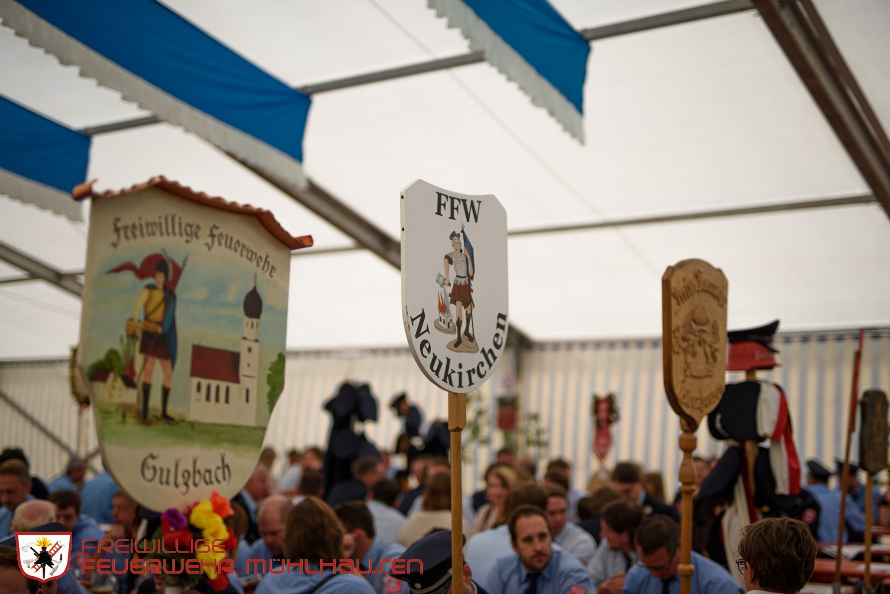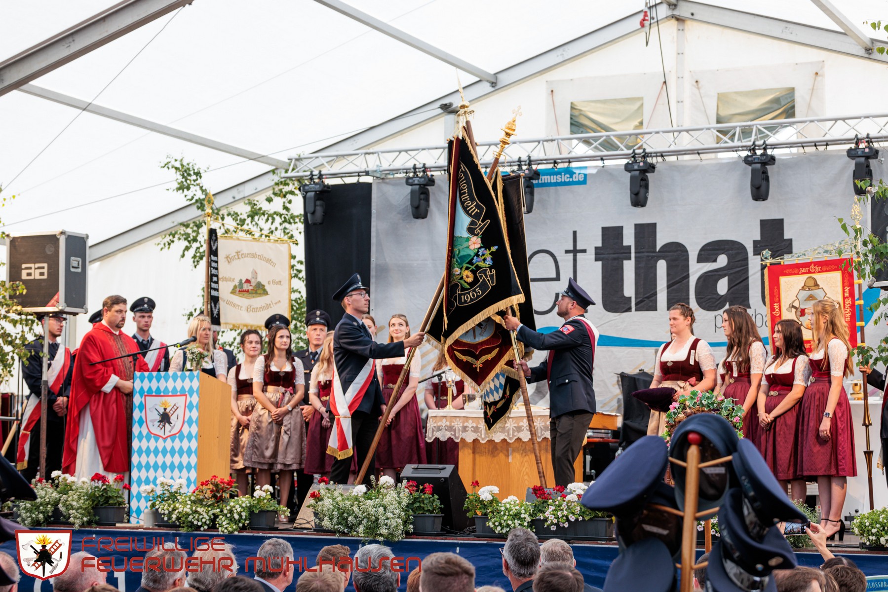 Bei den anschließenden Grußworten bedankte sich Jonas Maier bei der Familie Hartl für die Bereitstellung des Festplatzes, bei der Familie Lindermeir für die Parkplatzfläche und bei allen Helferinnen und Helfern. Er bedankte sich auch beim Schirmherrn für jegliche Unterstützung. Wolfgang Neukäufer, der Vorsitzende des Patenvereins (FF Gebenhofen), betonte den Stolz auf die Patenschaft und erwähnte, dass diese Partnerschaft sich bei Einsätzen immer wieder bezahlt macht, da man Hand in Hand zusammenarbeitet. Markus Winklhofer hob auch die modernen Wege in der Mühlhauser Wehr hervor. Das Crowdfunding beispielsweise hatte einen erheblichen Beitrag zur Spendensammlung für die Restaurierung der Standarte geleistet. Darüber hinaus brachten die Gäste auch Geschenke mit. Die Feuerwehr freute sich über einen Zuschuss von 1.500 Euro von der Gemeinde. Der Landrat spendierte ein Fass Freibier für den nächsten Kameradschaftsabend und der Landtagsabgeordnete Tomaschko lud eine Auswahl der FF Mühlhausen zum Oktoberfest ein. Letzterer äußerte auch große Freude über die Jugendarbeit.