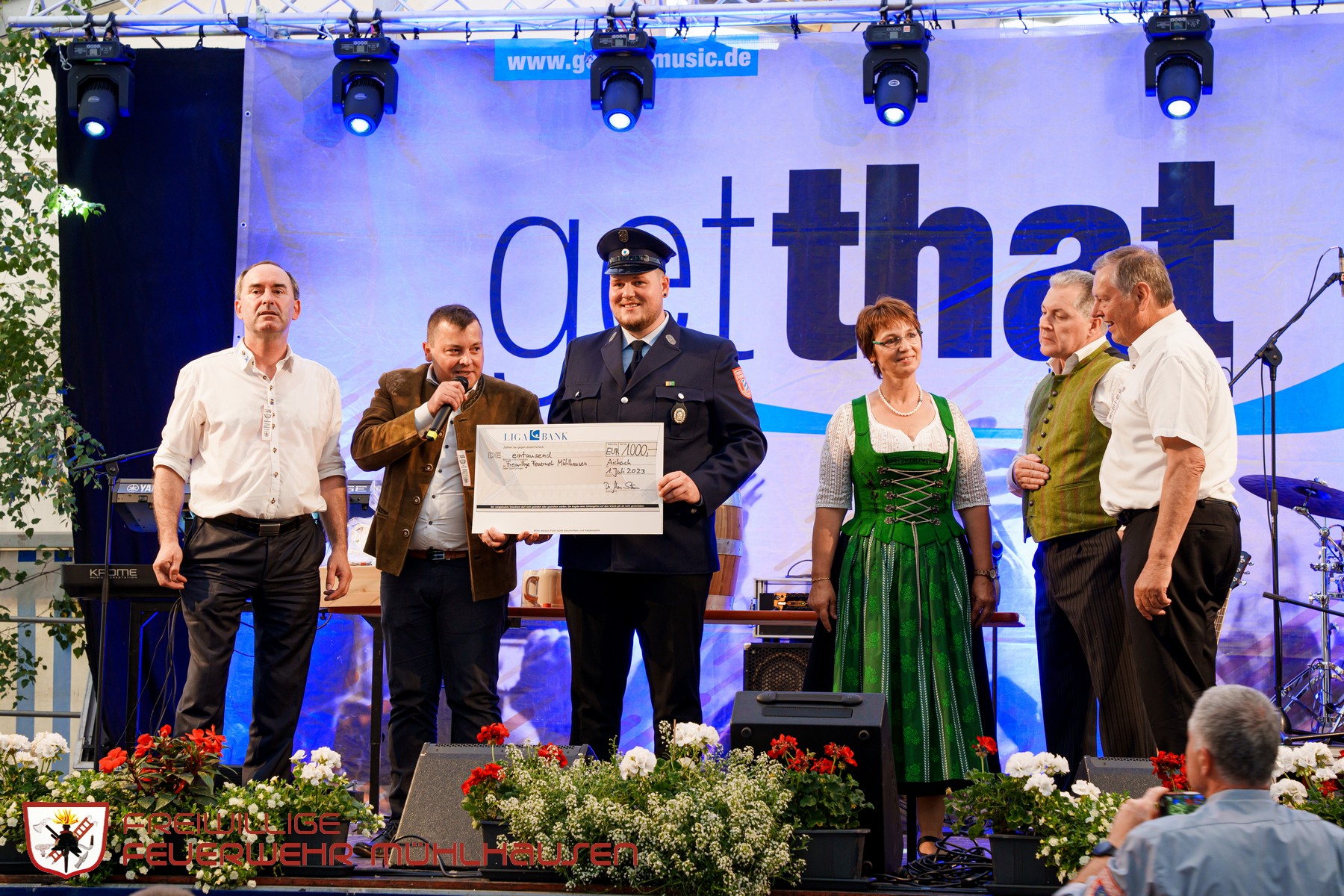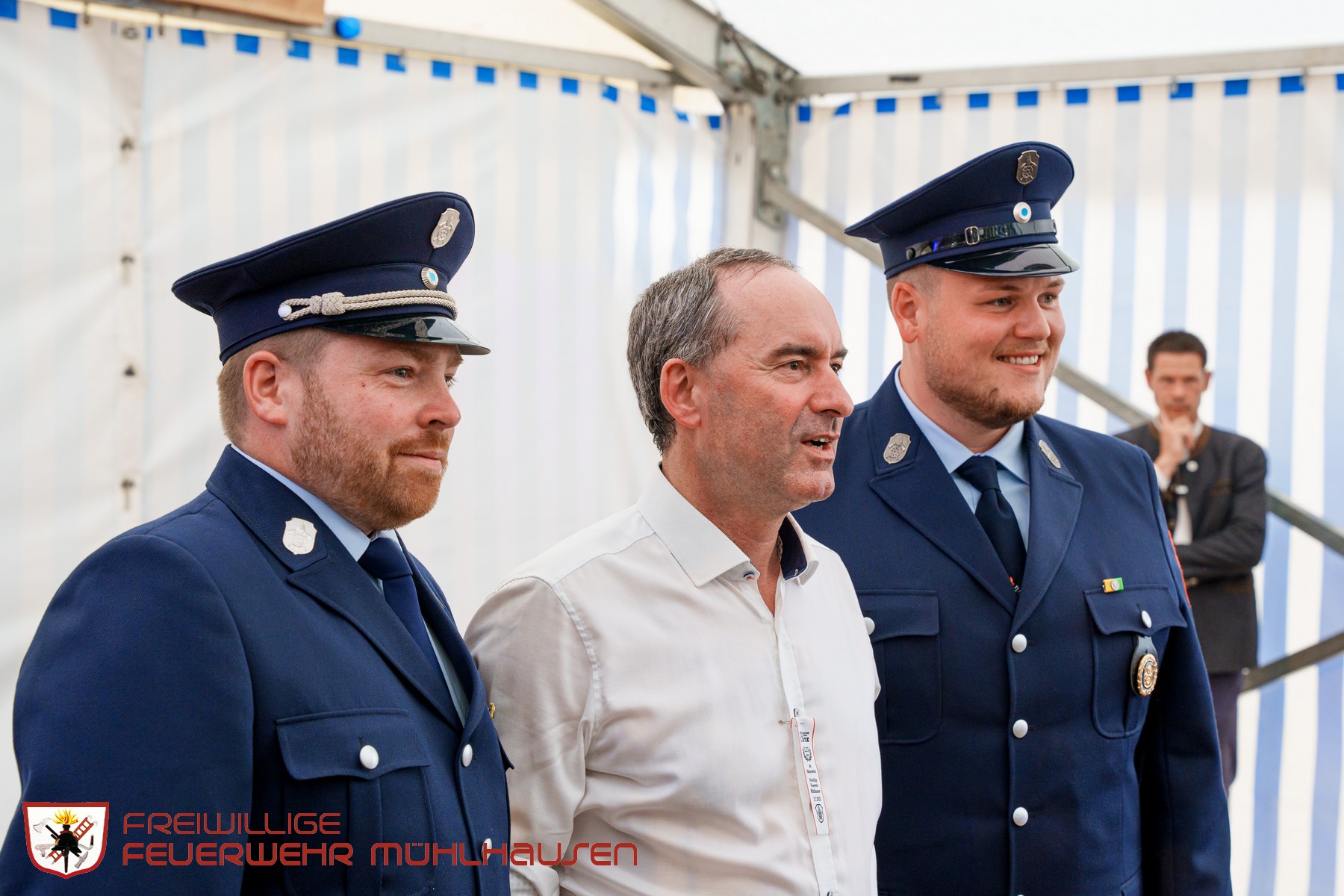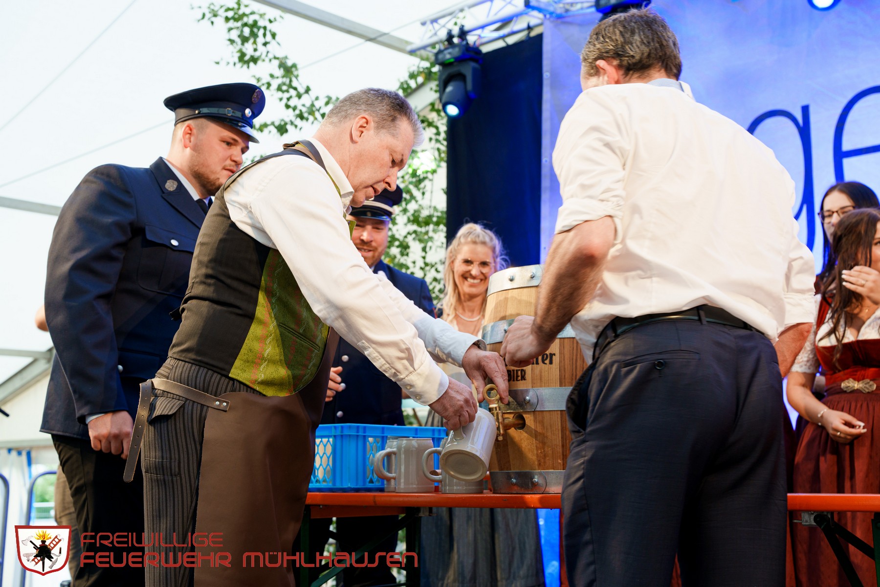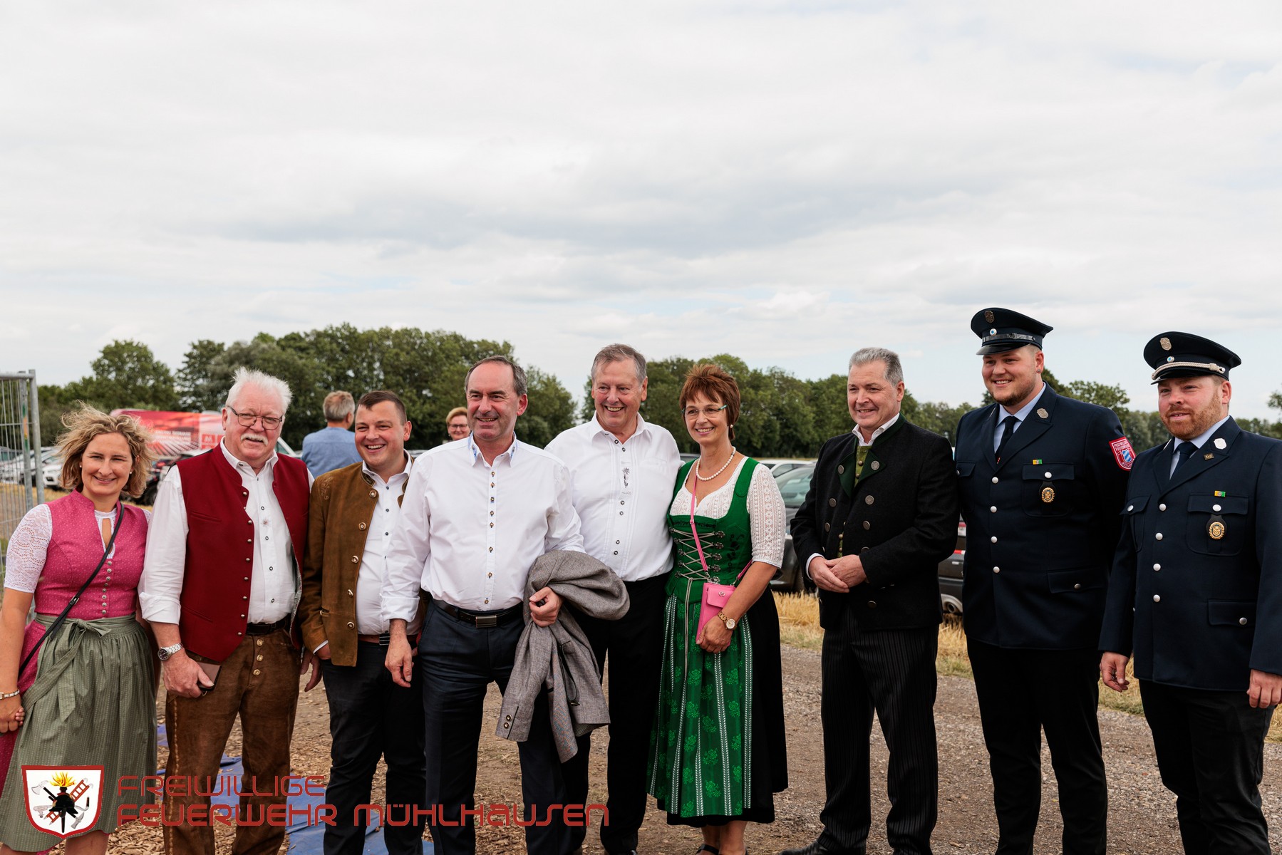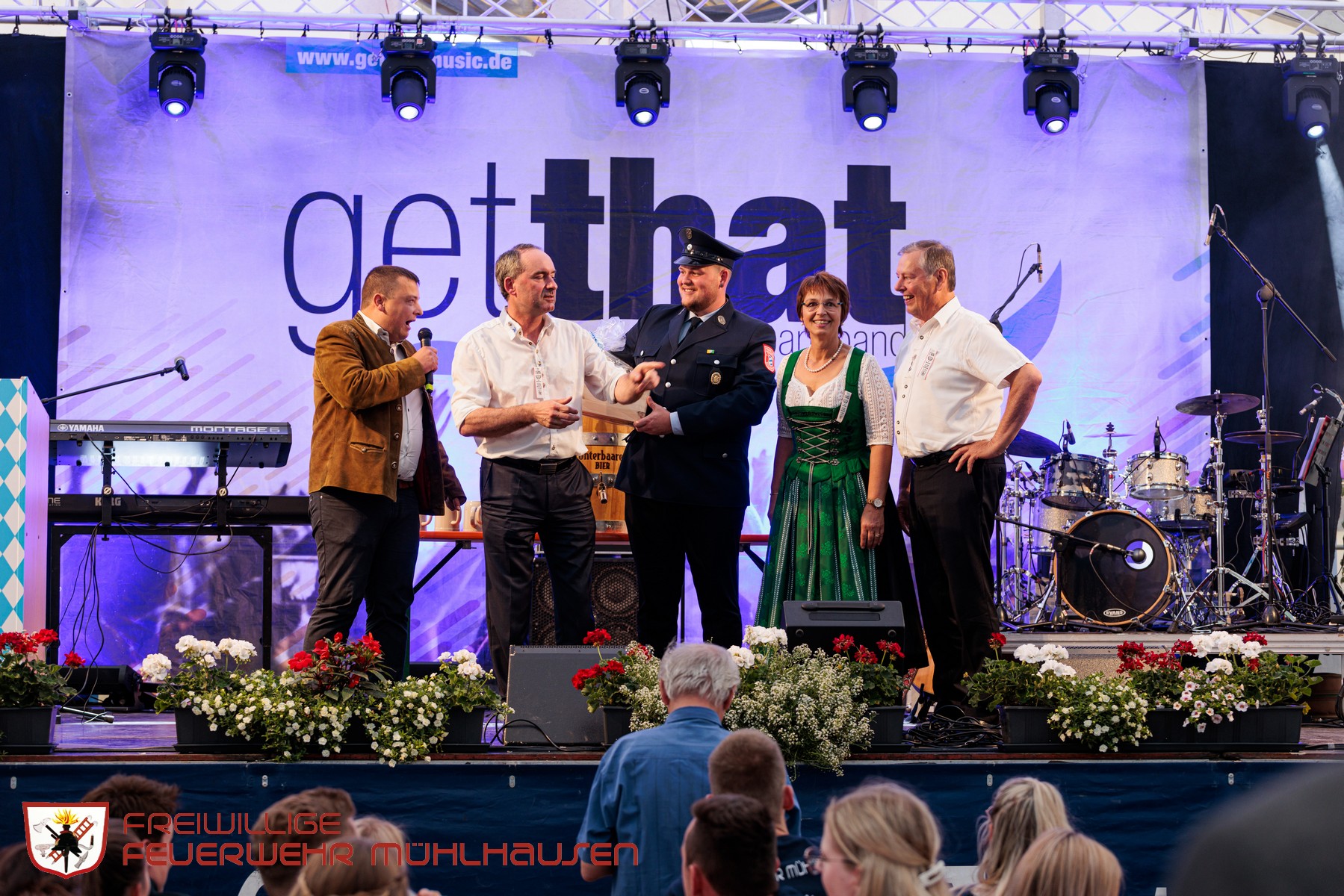 Bei den anschließenden Grußworten bedankte sich Jonas Maier bei der Familie Hartl für die Bereitstellung des Festplatzes, bei der Familie Lindermeir für die Parkplatzfläche und bei allen Helferinnen und Helfern. Er bedankte sich auch beim Schirmherrn für jegliche Unterstützung. Wolfgang Neukäufer, der Vorsitzende des Patenvereins (FF Gebenhofen), betonte den Stolz auf die Patenschaft und erwähnte, dass diese Partnerschaft sich bei Einsätzen immer wieder bezahlt macht, da man Hand in Hand zusammenarbeitet. Markus Winklhofer hob auch die modernen Wege in der Mühlhauser Wehr hervor. Das Crowdfunding beispielsweise hatte einen erheblichen Beitrag zur Spendensammlung für die Restaurierung der Standarte geleistet. Darüber hinaus brachten die Gäste auch Geschenke mit. Die Feuerwehr freute sich über einen Zuschuss von 1.500 Euro von der Gemeinde. Der Landrat spendierte ein Fass Freibier für den nächsten Kameradschaftsabend und der Landtagsabgeordnete Tomaschko lud eine Auswahl der FF Mühlhausen zum Oktoberfest ein. Letzterer äußerte auch große Freude über die Jugendarbeit.