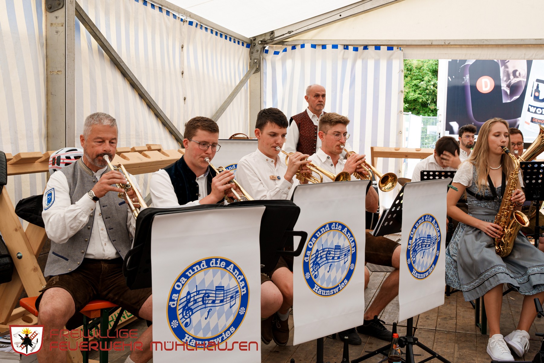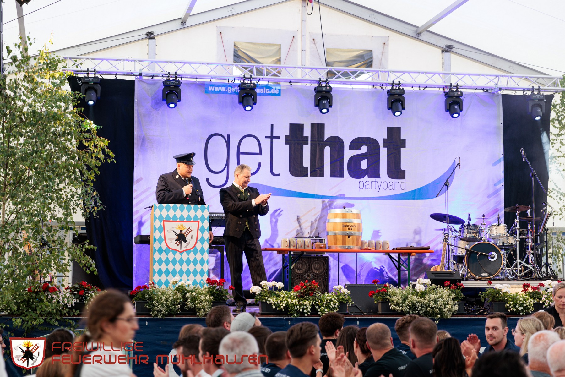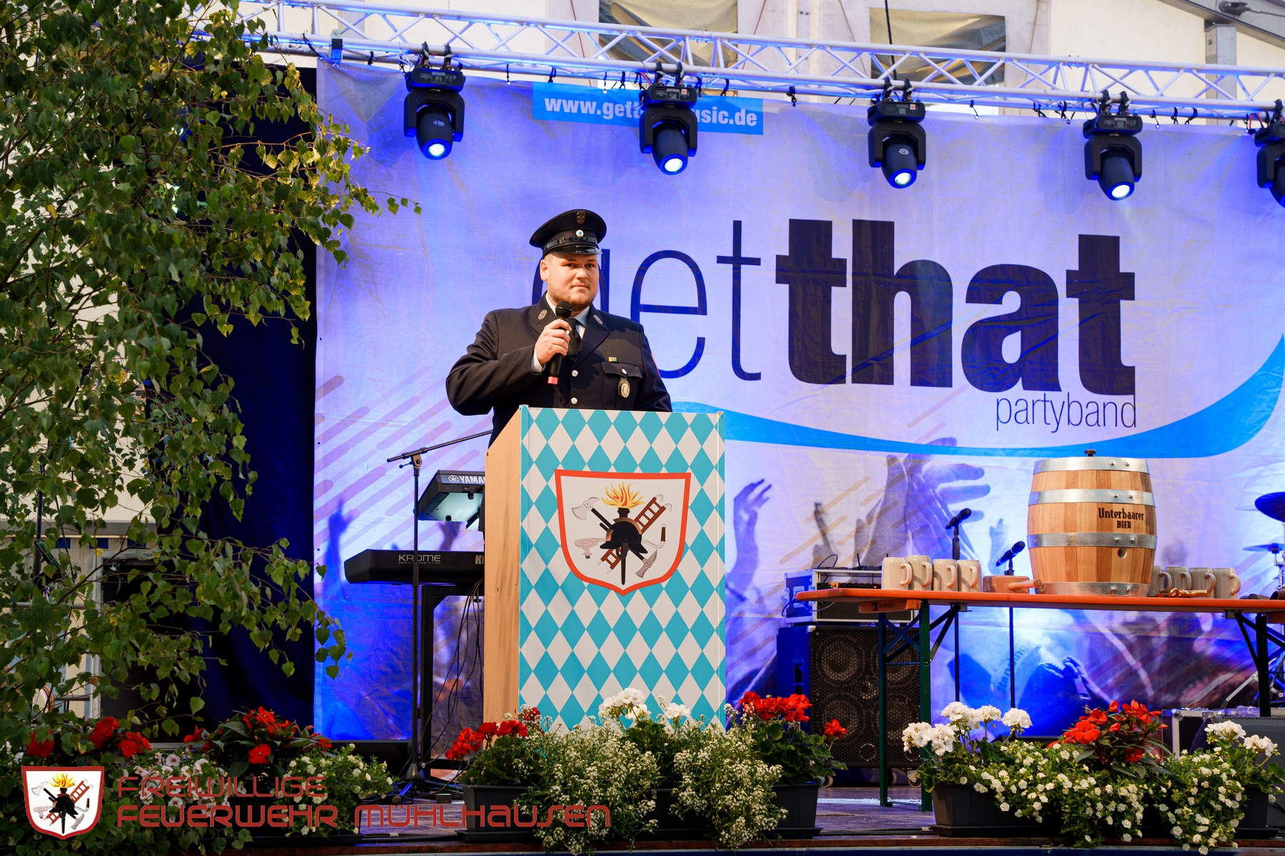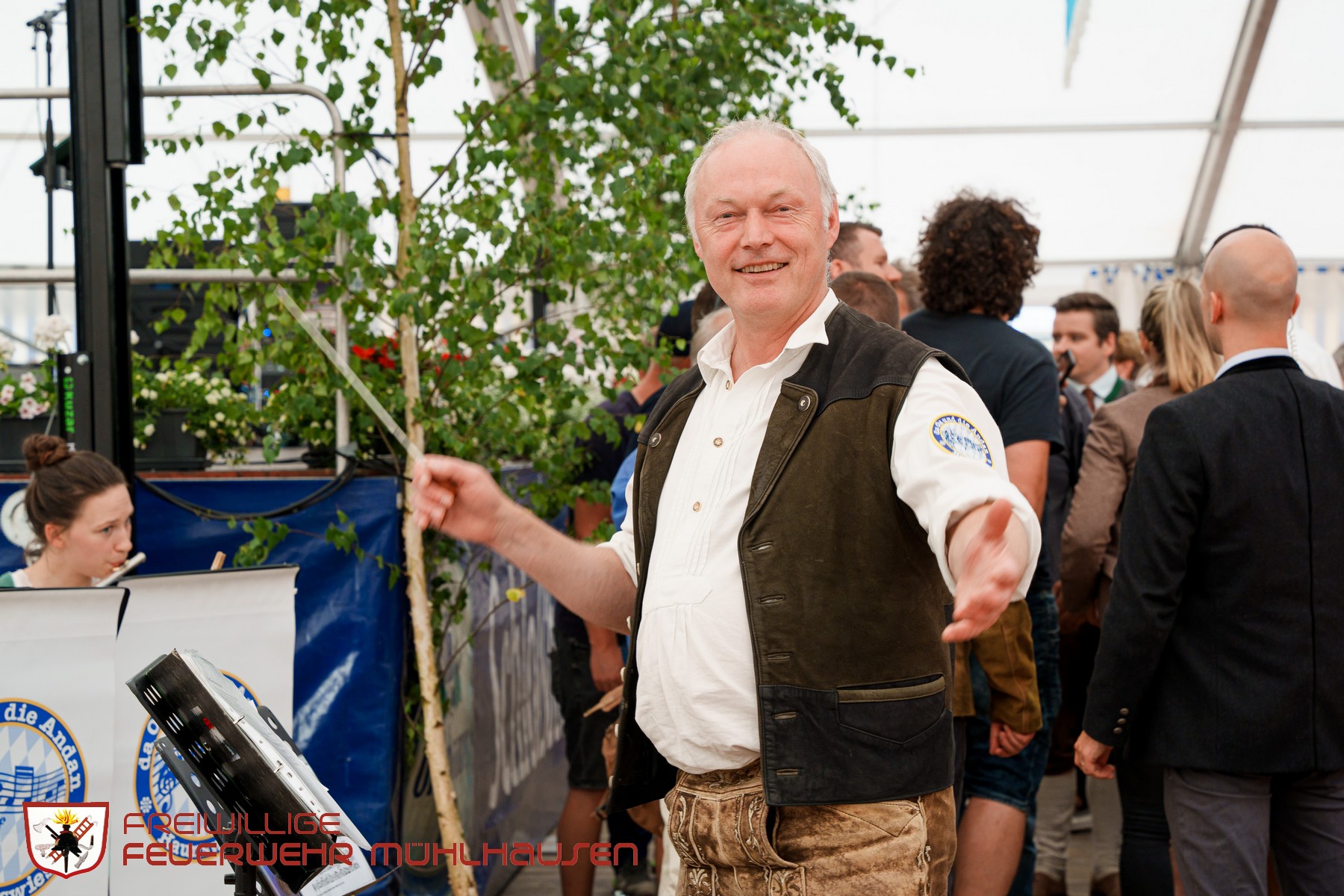 Bei den anschließenden Grußworten bedankte sich Jonas Maier bei der Familie Hartl für die Bereitstellung des Festplatzes, bei der Familie Lindermeir für die Parkplatzfläche und bei allen Helferinnen und Helfern. Er bedankte sich auch beim Schirmherrn für jegliche Unterstützung. Wolfgang Neukäufer, der Vorsitzende des Patenvereins (FF Gebenhofen), betonte den Stolz auf die Patenschaft und erwähnte, dass diese Partnerschaft sich bei Einsätzen immer wieder bezahlt macht, da man Hand in Hand zusammenarbeitet. Markus Winklhofer hob auch die modernen Wege in der Mühlhauser Wehr hervor. Das Crowdfunding beispielsweise hatte einen erheblichen Beitrag zur Spendensammlung für die Restaurierung der Standarte geleistet. Darüber hinaus brachten die Gäste auch Geschenke mit. Die Feuerwehr freute sich über einen Zuschuss von 1.500 Euro von der Gemeinde. Der Landrat spendierte ein Fass Freibier für den nächsten Kameradschaftsabend und der Landtagsabgeordnete Tomaschko lud eine Auswahl der FF Mühlhausen zum Oktoberfest ein. Letzterer äußerte auch große Freude über die Jugendarbeit.