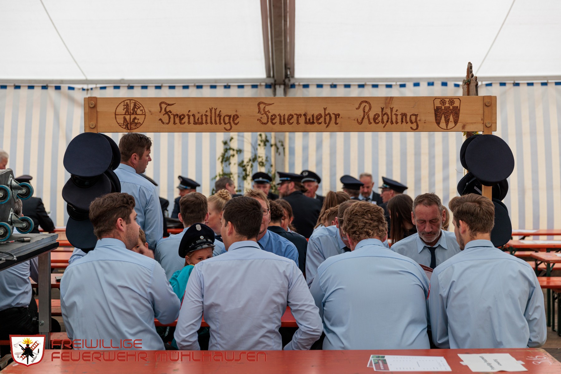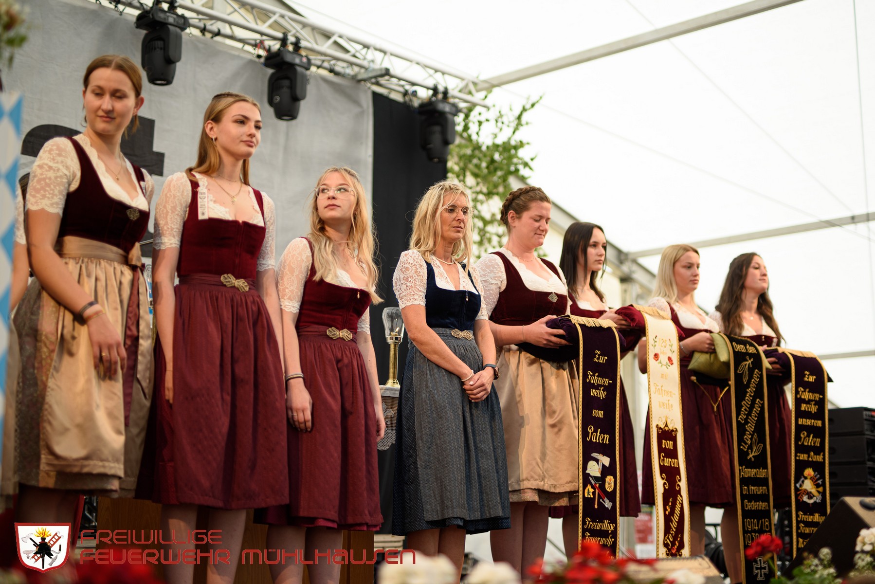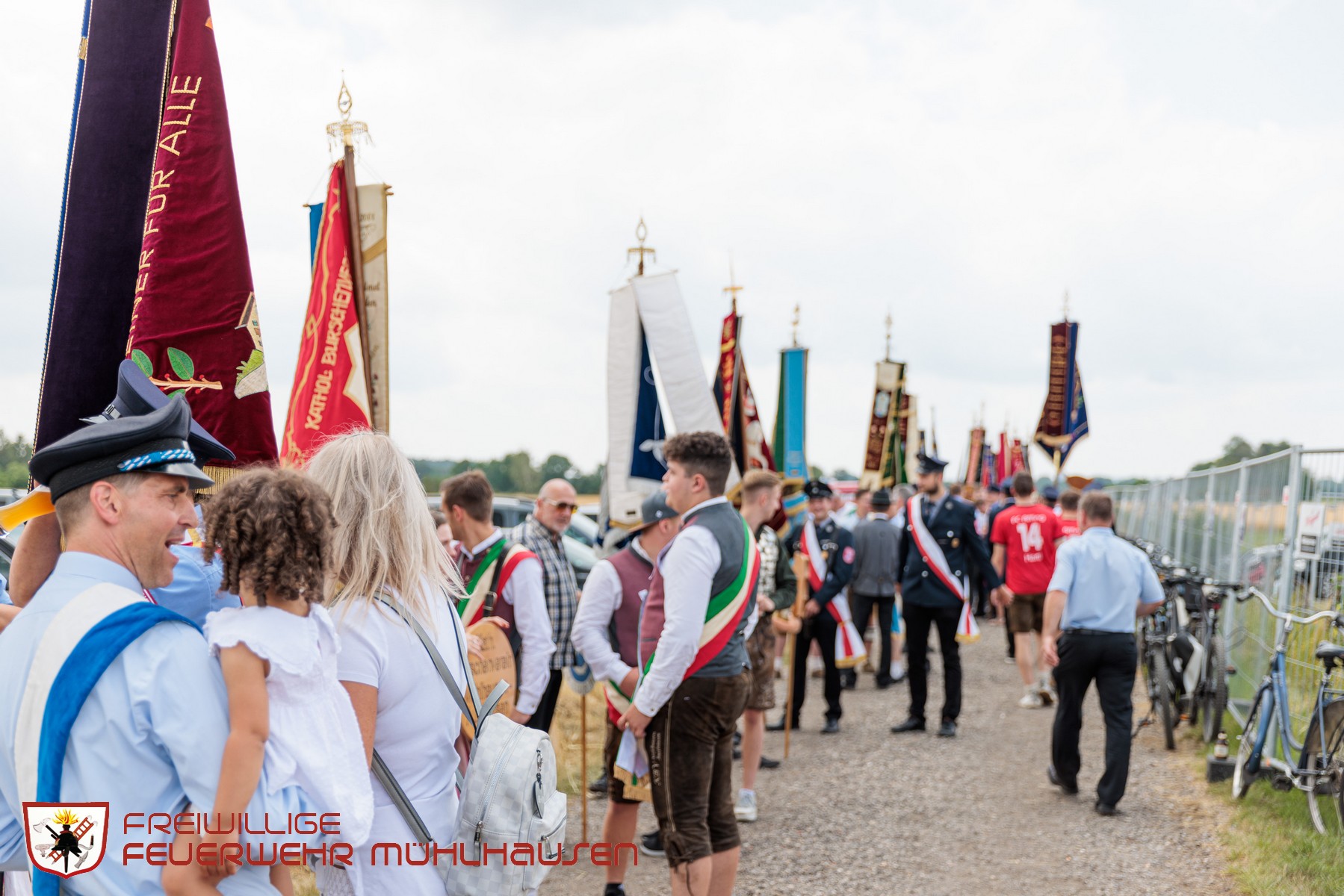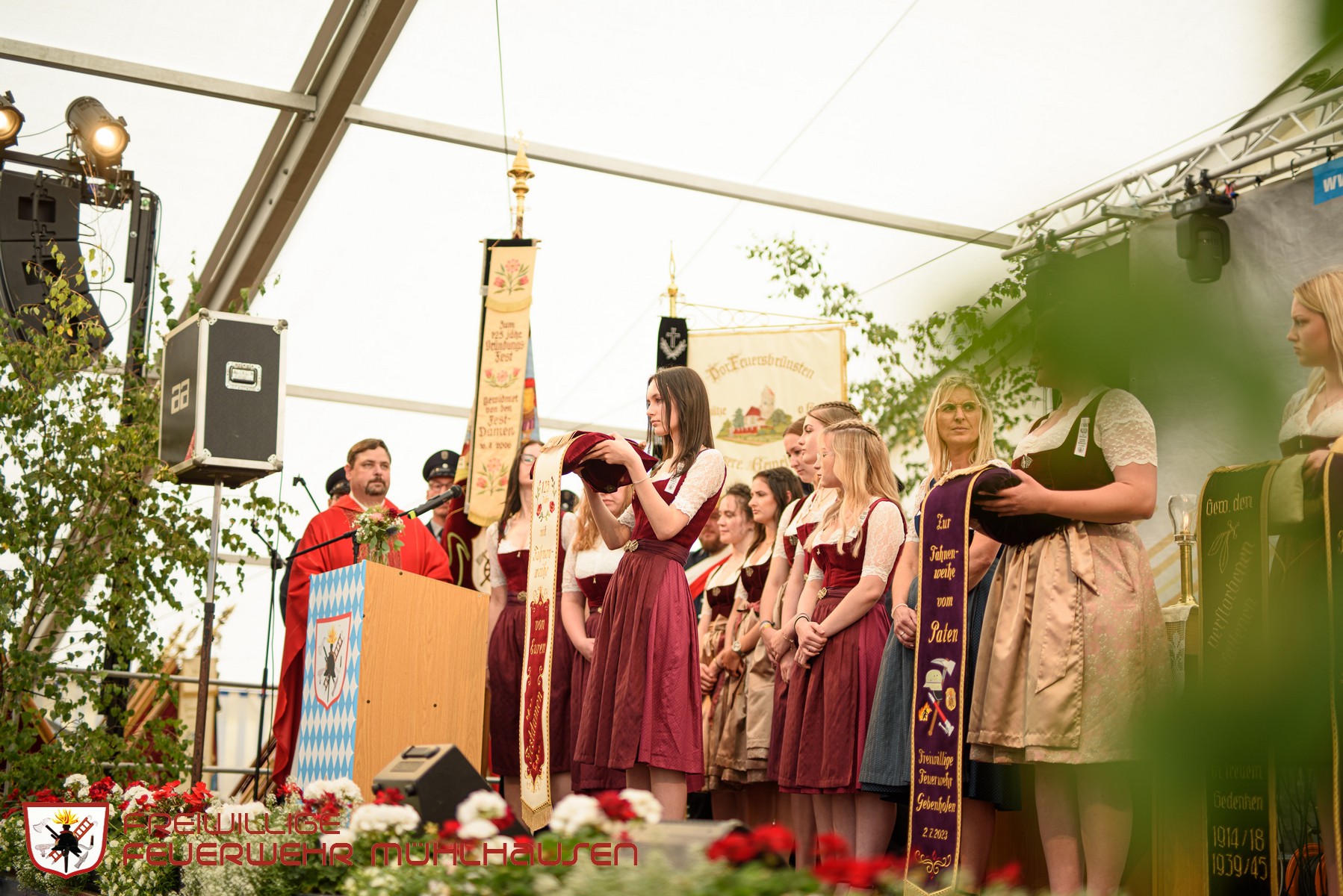 Aber auch am nächsten Tag gab es viel zu erleben. Um 6 Uhr erfolgte der Weckruf, bei dem die Festdamen von Traktoren abgeholt wurden. Diese Aktion wurde von der Rehlinger Musikkapelle musikalisch begleitet. Ab 8 Uhr wurden die Vereine von den Kameraden aus Mühlhausen und dem Patenverein Gebenhofen mit einem Spalier begrüßt, während im Zeltinneren der Tag mit einem Weißwurstfrühstück begann. Ein erster emotionaler Moment für die FF Mühlhausen war der Festgottesdienst, bei dem die Fahne und die Standarte geweiht wurden. Pfarrer Max Bauer lobte insbesondere den Zusammenhalt der Feuerwehren. Gerade das Zusammenwirken einer Vielzahl von Personen, welche für den Erhalt der Standarte sorgte, spricht für die Gemeinschaft. Außerdem betonte er die Bedeutung des Selbstschutzes und der Fürsorge für die Kameraden. Darüber hinaus wurden auch die Fahnenbänder zwischen den Feuerwehren Gebenhofen und Mühlhausen ausgetauscht.