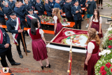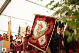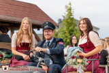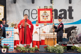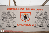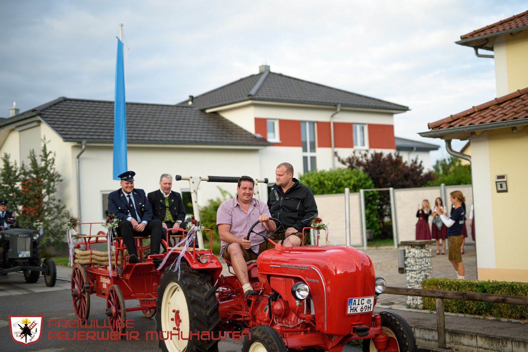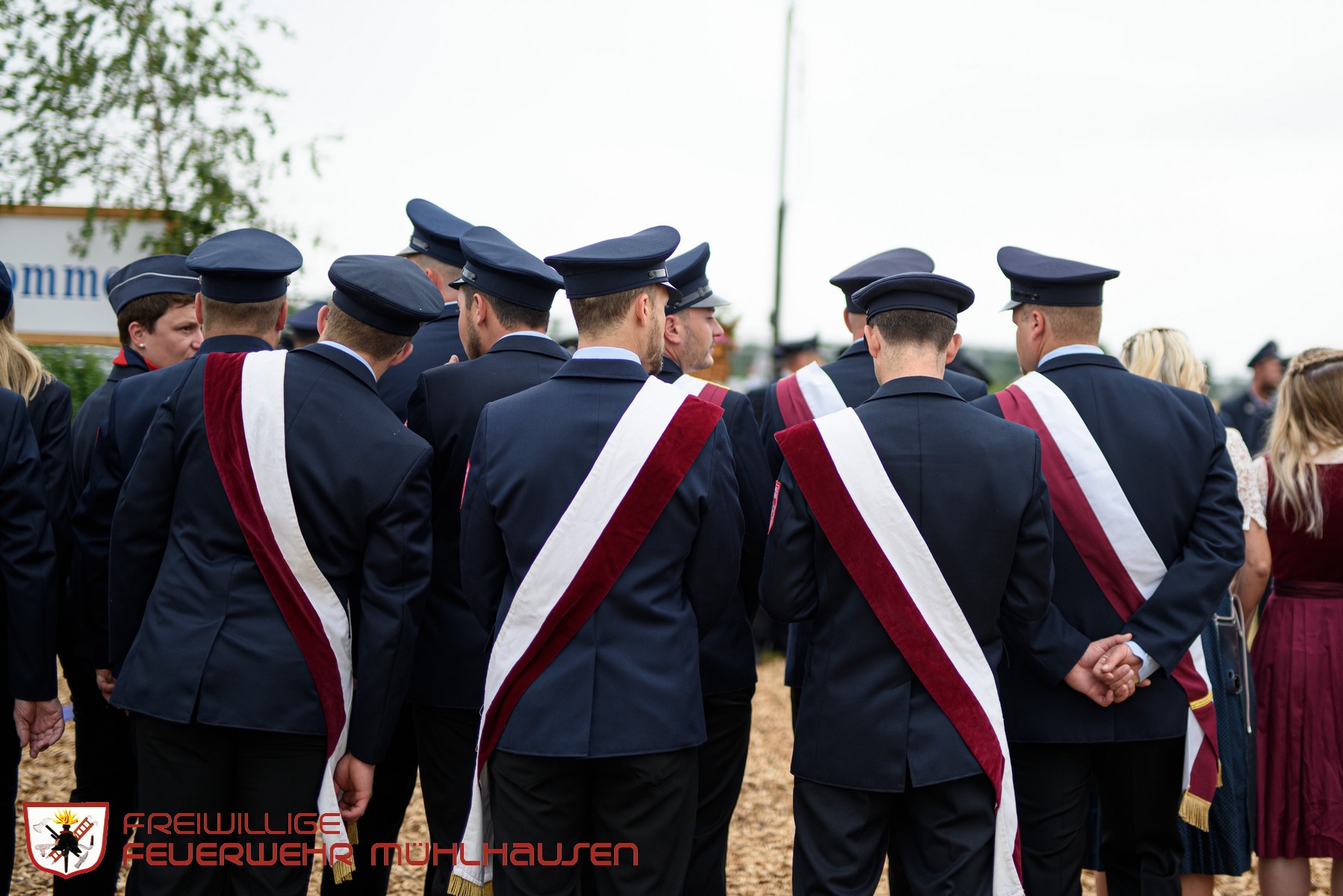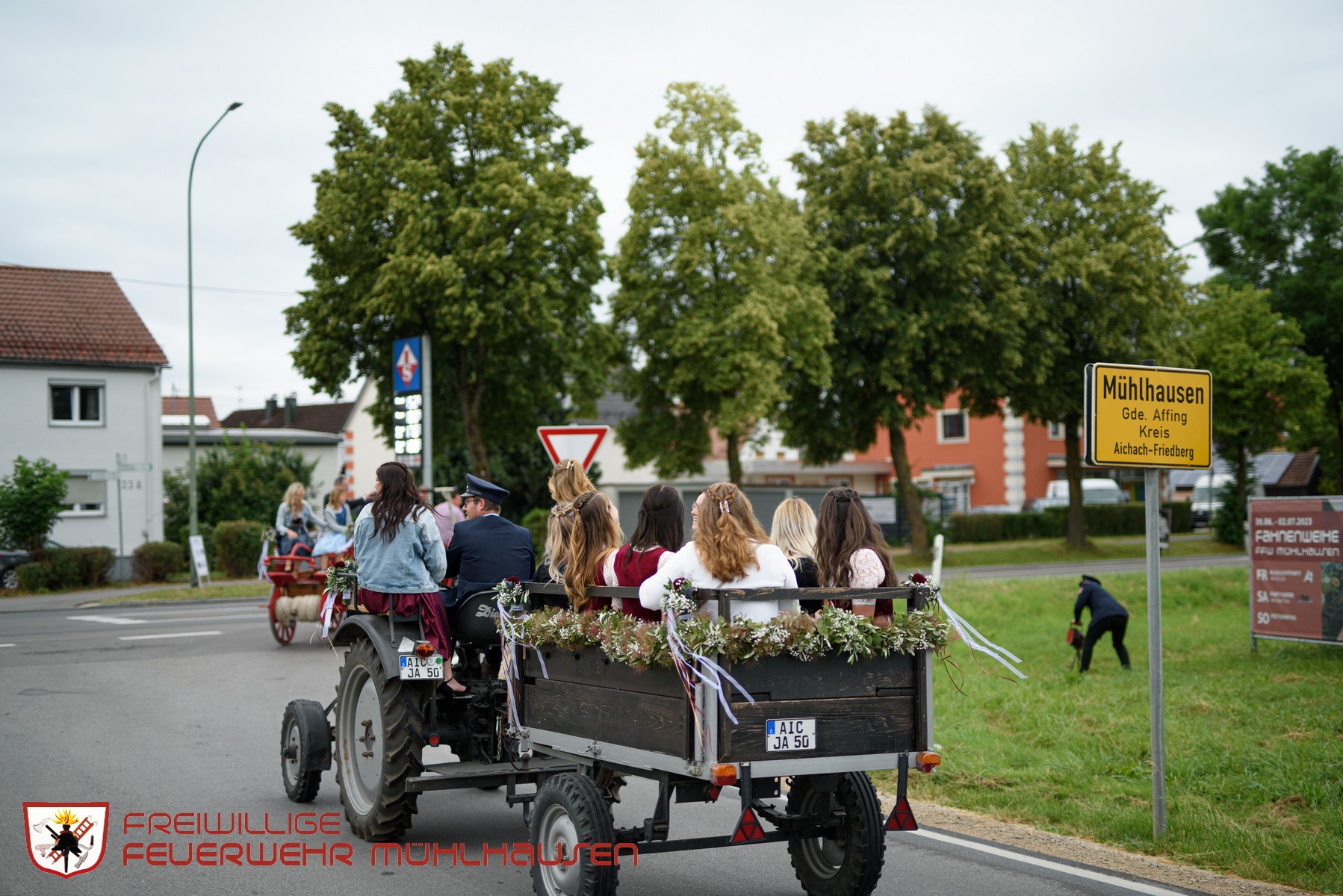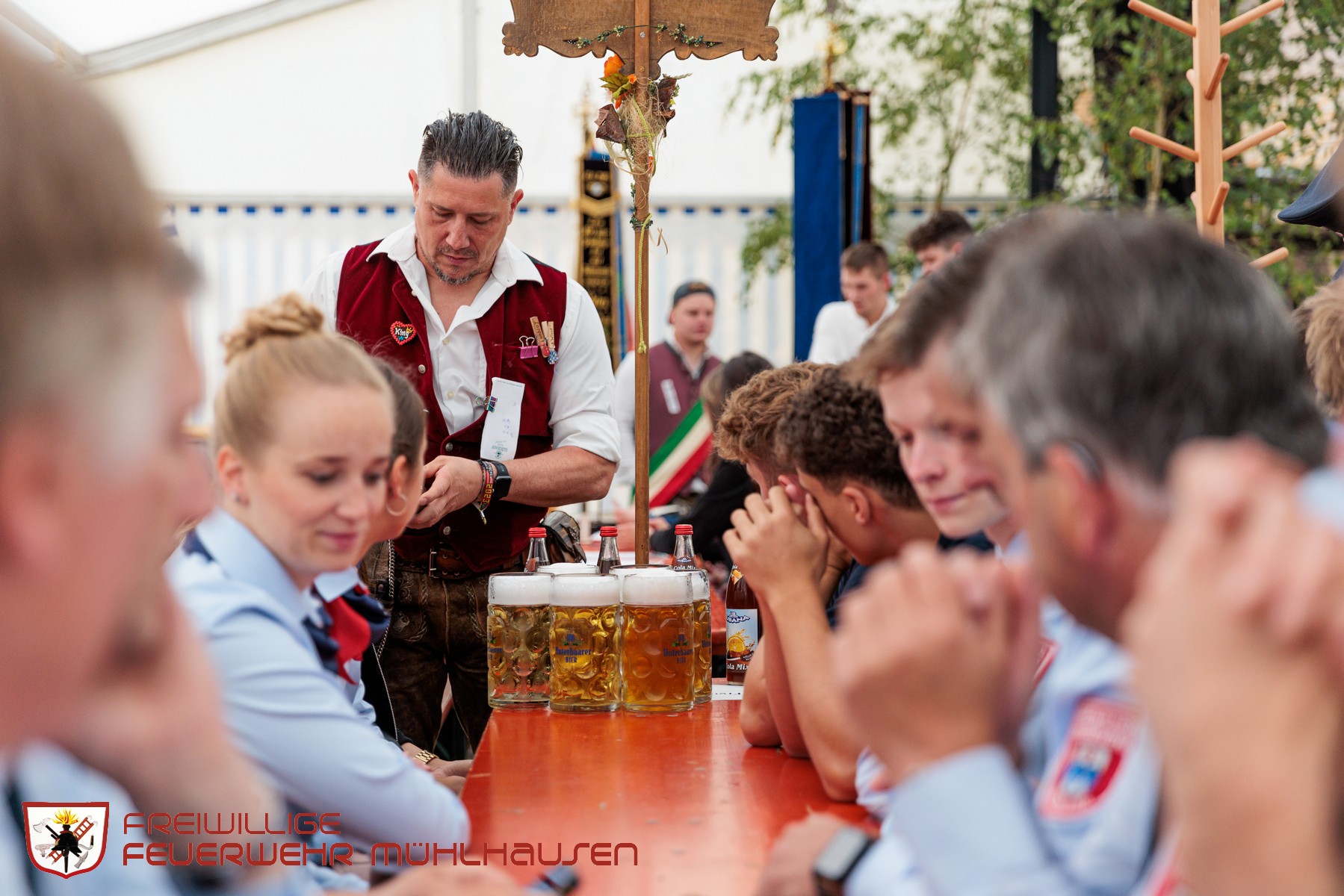 Aber auch am nächsten Tag gab es viel zu erleben. Um 6 Uhr erfolgte der Weckruf, bei dem die Festdamen von Traktoren abgeholt wurden. Diese Aktion wurde von der Rehlinger Musikkapelle musikalisch begleitet. Ab 8 Uhr wurden die Vereine von den Kameraden aus Mühlhausen und dem Patenverein Gebenhofen mit einem Spalier begrüßt, während im Zeltinneren der Tag mit einem Weißwurstfrühstück begann. Ein erster emotionaler Moment für die FF Mühlhausen war der Festgottesdienst, bei dem die Fahne und die Standarte geweiht wurden. Pfarrer Max Bauer lobte insbesondere den Zusammenhalt der Feuerwehren. Gerade das Zusammenwirken einer Vielzahl von Personen, welche für den Erhalt der Standarte sorgte, spricht für die Gemeinschaft. Außerdem betonte er die Bedeutung des Selbstschutzes und der Fürsorge für die Kameraden. Darüber hinaus wurden auch die Fahnenbänder zwischen den Feuerwehren Gebenhofen und Mühlhausen ausgetauscht.