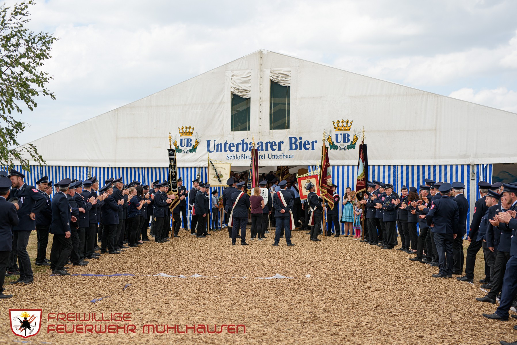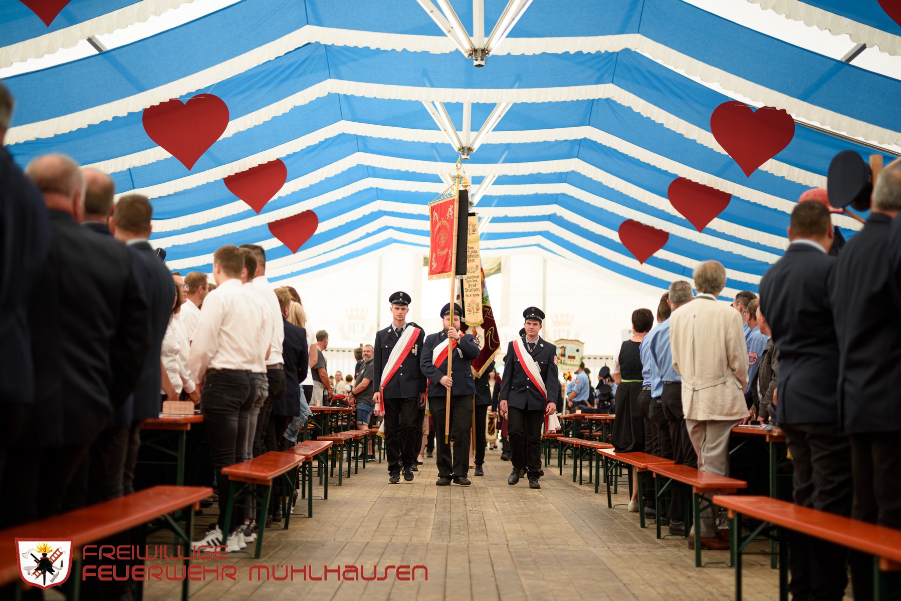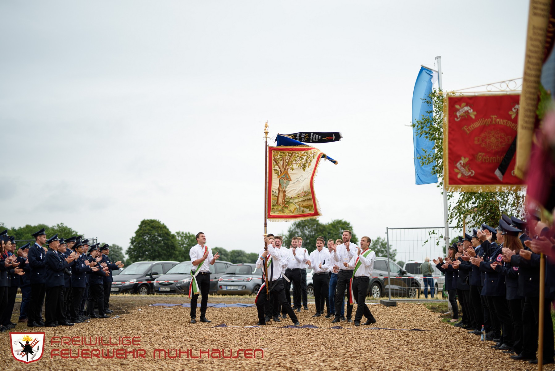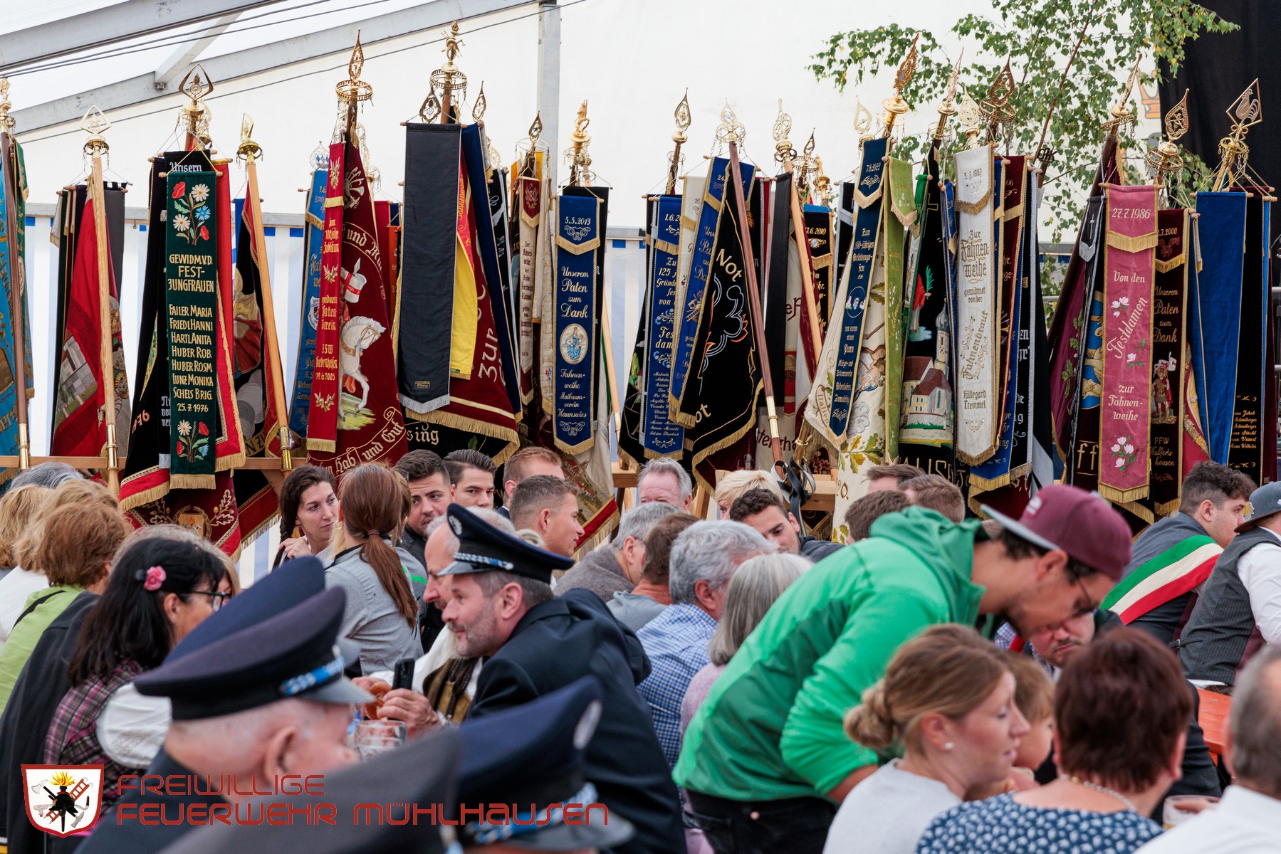 Gegen Nachmittag folgte dann der nächste besondere Moment: Der Einzug der Vereine. Dabei konnte man eine Vielzahl der mitgebrachten Fahnen bestaunen, was von den Festgästen mit großem Applaus begleitet wurde. Für die Mitglieder der Feuerwehr Mühlhausen war dies das große Finale der langjährigen Planungen und somit ein sehr besonderer Moment. Es bot sich die Gelegenheit, die restaurierte Vereinsfahne und -standarte noch einmal stolz zu präsentieren.