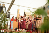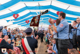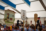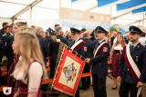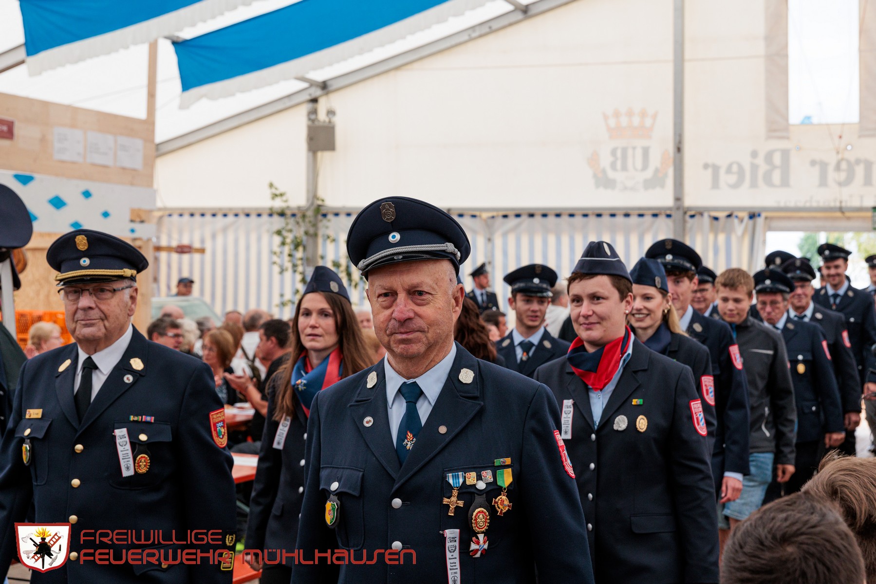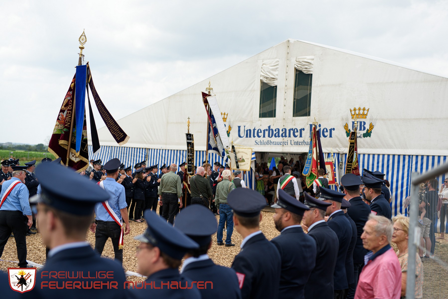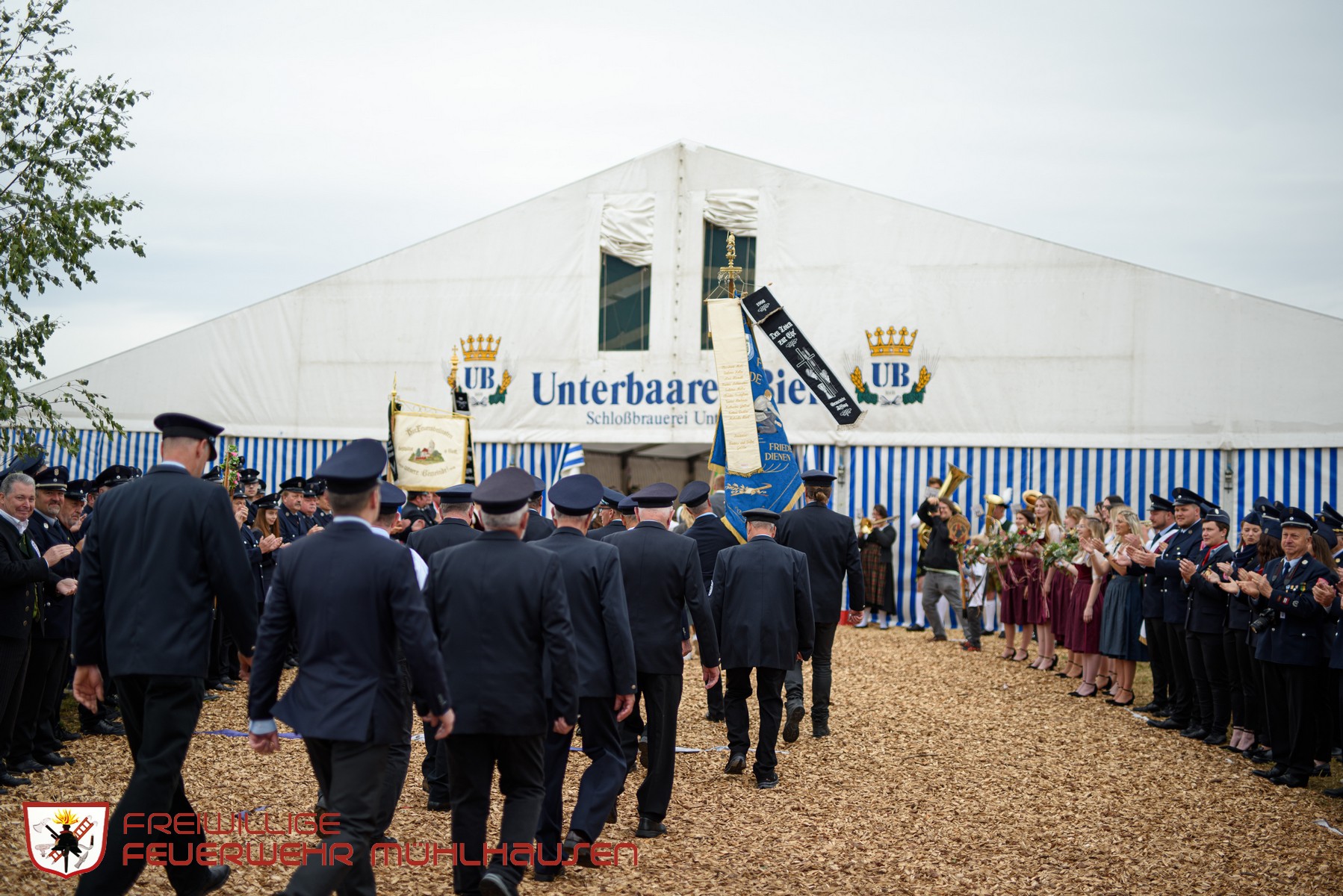 Gegen Nachmittag folgte dann der nächste besondere Moment: Der Einzug der Vereine. Dabei konnte man eine Vielzahl der mitgebrachten Fahnen bestaunen, was von den Festgästen mit großem Applaus begleitet wurde. Für die Mitglieder der Feuerwehr Mühlhausen war dies das große Finale der langjährigen Planungen und somit ein sehr besonderer Moment. Es bot sich die Gelegenheit, die restaurierte Vereinsfahne und -standarte noch einmal stolz zu präsentieren.