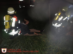 Die Jugendlichen im Keller, waren schwerer zu bergen: Sie waren „bewusstlos“ und sollten aus dem mit „Rauch“ gefüllten Keller hinausgetragen werden. Als die Übung dann im Anbruch der Dämmerung losging, stürmten Atemschutzträger das Haus und begannen die versteckten Jugendlichen zu suchen. Der „Rauch“ nahm ihnen dabei jegliche Sicht, was die Suche um einiges erschwerte. Versteckt waren die jungen Darsteller überall, bis in die letzten Winkel des Gebäudes. Letztendlich wurden jedoch alle gefunden und sicher gerettet.