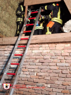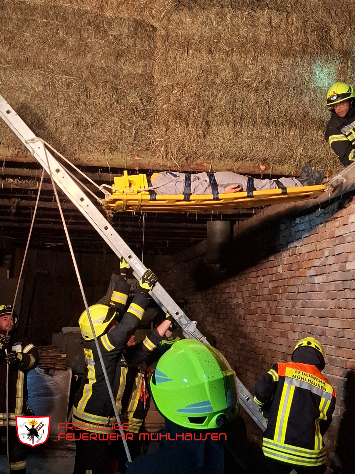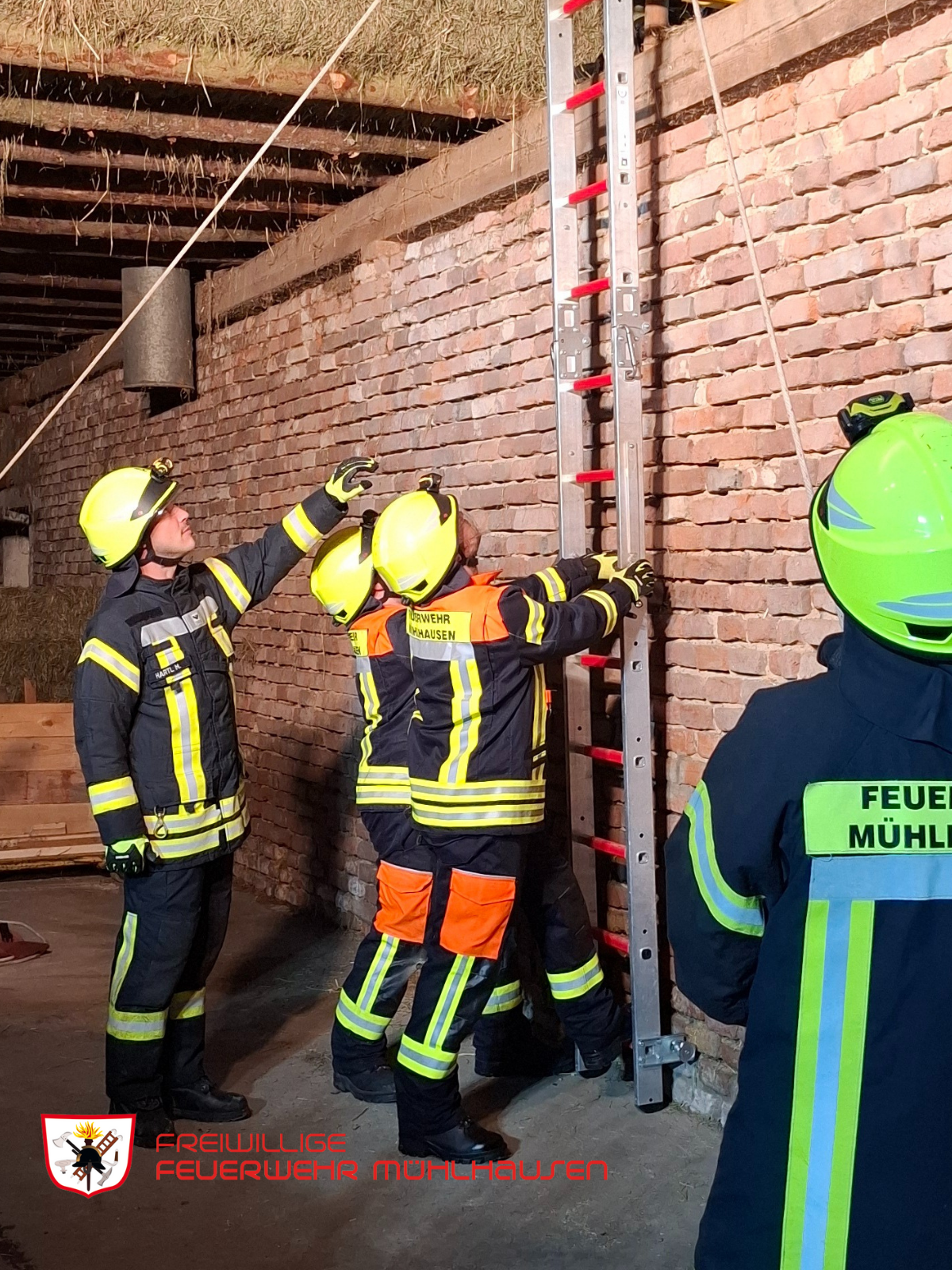Im ersten Szenario wurde eine verletzte Person auf dem Heuboden vermisst. Eine besondere Herausforderung bestand darin, dass die Sicht durch die zunehmende Dunkelheit stark eingeschränkt war und es keine direkte Zugangsmöglichkeit zum Heuboden gab – die vorhandene Treppe war im Rahmen der Übung gesperrt. Die Einsatzstelle wurde deshalb mithilfe von Scheinwerfern und einem Löschfahrzeug großflächig ausgeleuchtet, um sicheres Arbeiten zu gewährleisten. Ein Trupp, ausgerüstet mit dem Rettungsrucksack, wurde über eine Steckleiter nach oben geschickt. Dort fanden sie die Übungspuppe, eingeklemmt unter einem Heuballen. Nach Anweisung des fiktiv anwesenden Notarztes musste die Person sofort befreit und schonend nach unten gebracht werden. Während der Patient weiter betreut und für den Transport vorbereitet wurde, richteten die Einsatzkräfte den sogenannten Leiterhebel ein. Über diese Methode gelang es, die Person sicher auf Bodenniveau zu transportieren.