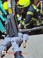 Im zweiten Szenario wurde angenommen, dass eine Person unter einer Hubgabel eingeklemmt war. Das Fahrzeug konnte nicht bewegt werden, zudem war die Person reanimationspflichtig. Zunächst wurde das Fahrzeug gegen Wegrollen gesichert. Danach bildeten die Einsatzkräfte zwei Arbeitsbereiche: Während an der Person sofort die Reanimation durchgeführt und dabei das Durchwechseln der Aufgaben (Herzdruckmassage/Beatmung) geübt wurde, begannen andere Kameraden mit der technischen Rettung. Unter Zuhilfenahme eines Wagenhebers wurde der vordere Teil des Fahrzeugs angehoben und gleichzeitig mit Rüstholz gegen ein unkontrolliertes Absacken gesichert. So konnte die Person schließlich befreit, in einen sicheren Bereich gebracht und anschließend dem fiktiven Rettungsdienst übergeben werden.