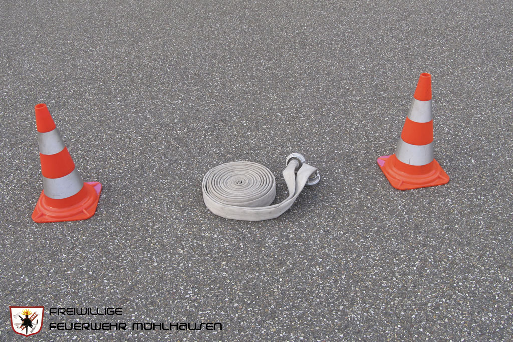 Nachdem das erste Eis gebrochen war, wurden einige Verhaltensregeln besprochen - und schon ging es für die Jugendlichen in den ersten Praxisteil: gemeinsam mit den Ausbildern wurde den Kids vor der Fahrzeughalle der C- und B-Schlauch erklärt. Die Jugendlichen lernten dabei auch, wie man die Schläuche aus- und einrollt und konnten dabei eine erste Genauigkeit im "Zielausrollen" beweisen.