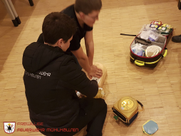 Im zweiten und praktischen Teil der Übung konnten wir dann das Wissen praktisch anwenden. Neben dem Messen von Blutdruck mittels Messgerät und Stethoskop übten wir auch das Auffinden einer leblosen Person mit verschiedenen Ausprägungen. Während bei vorhandener Atmung die stabile Seitenlage die richtige Wahl ist, gilt es bei fehlendem Kreislauf eine Herz-Lungen-Wiederbelebung durchzuführen. Auch diese übten wir sowohl mit als auch ohne den Einsatz eines Laiendefibrillators (ein solches Gerät hängt übrigens direkt am Feuerwehrhaus).